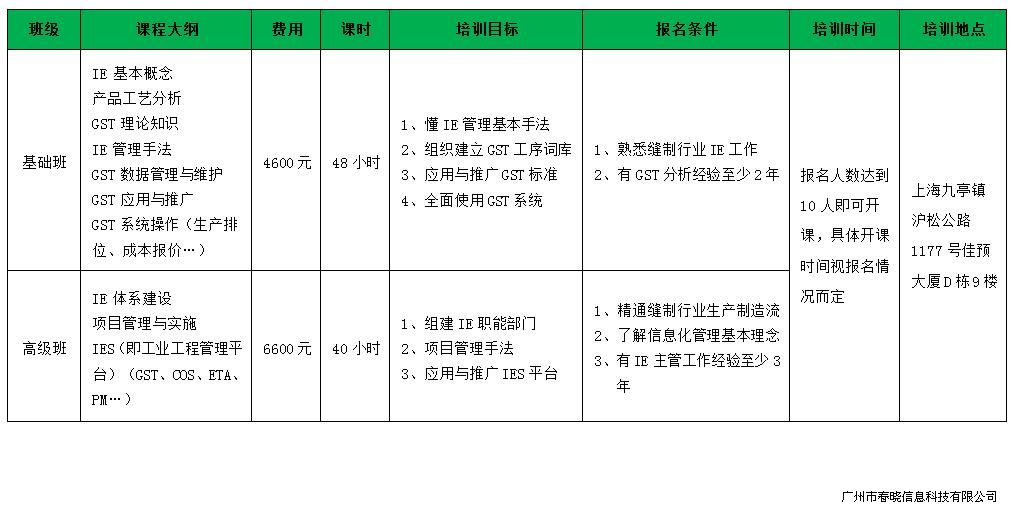 鉴于目前缝制行业IE方面的人才比较欠缺,以及众多行业从业人员希望有学习的机会,xingkong.com将根据行业需求,携手创定公司,在上海组织开展IE相关培训班,欢迎大家报名!具体如下: